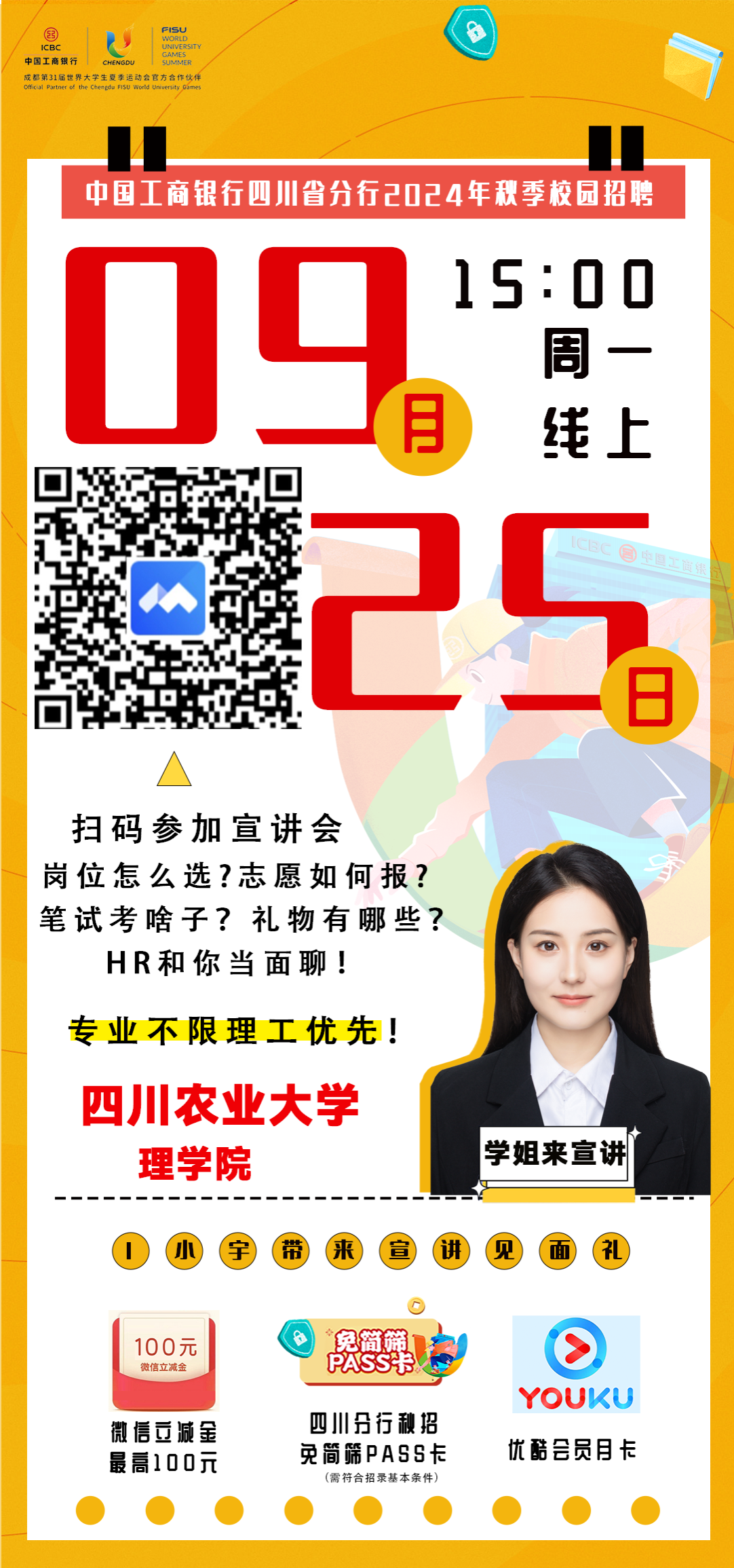 #诚邀你参加工行校招定制空宣-kaiyun登录中国入口登录kaiyun登录中国入口登录专场# 860个席位,覆盖全川,专业不设限、平台大、机会多、待遇好!“如何找到一份能上热搜的offer”,与工行HR空中相聚给你答案!