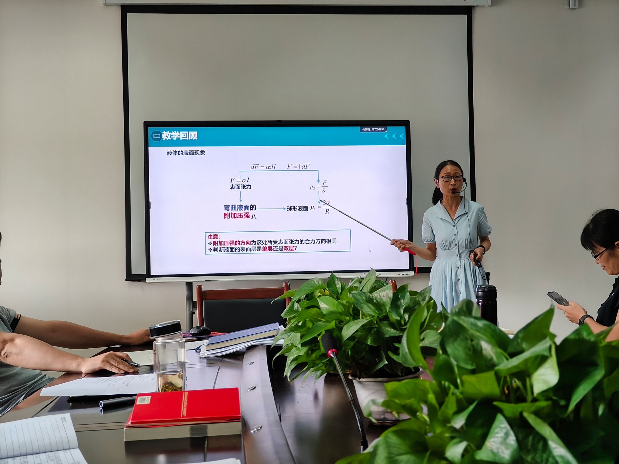在示范课环节,学院邀请应用物理系卢常芳教授就主讲的《大学物理B》课程“附加压强的应用”章节,开展了一场生动、精彩的课堂教学示范。卢老师精心设计教学内容,主要围绕“球形液膜内外压强差”与“土壤中悬着水”两个教学案例展开,教学目标清晰明确。课堂中,她坚持以学生为中心的教学理念,通过即时练习、学生分析讨论及动手参与实验演示等多元化互动方式,极大地提升了学生的参与度与学习兴趣。更以问题为导向,从大小肥皂泡连通后的变化情况进一步拓展到呼吸过程中动物肺泡变化,引导学生深入思考物理现象背后的原理,进而拓展至更广阔的知识领域。尤为值得一提的是,卢老师巧妙地将学生实验与天宫课堂的实验演示相结合,在展现物理学的奇妙魅力的同时,也彰显了我国航天科技的辉煌成就。整堂课设计精妙,既培养了学生的物理科学思维,又充分体现了学科间的交叉融合。