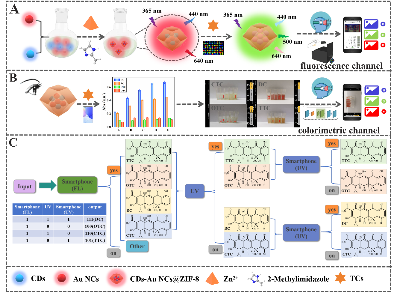 四环素类抗生素(TCs)是由放线菌产生的一类广谱抗生素,常见的TCs主要包括四环素(TTC)、土霉素(OTC)、多西环素(DC)和金霉素(CTC),广泛应用于疾病治疗和畜牧行业。然而,目前有许多TCs快速检测平台被报道,大多只能实现这一类物质的定量或定性检测,很难对单个天然四环素类似物的成分进行鉴定。为了解决这一问题,该团队基于多通道逻辑门策略,构建了一个更为稳定的复合比率荧光传感器CDs-Au NCs@ZIF-8,结合基于深度学习辅助的智能手机和比色荧光通道,构建多模式逻辑门。该逻辑门能够识别TCs的四种类似物。TCs通过与BSA之间存在的敏化作用以及与ZIF-8之间存在的π-π相互作用和氢键作用,使得在500 nm处出现了一个新的荧光发射峰。由于红色和蓝色峰的猝灭,可观察到荧光颜色由红色变为黄色,利用课题组新升级的小程序“96 Speckle”和96孔板实现了未知溶液中TCs的快速高通量初筛。利用不同TCs结构式和日光下颜色不同的特点,将筛选出的TCs再进行紫外分析和日光下的比色分析。通过信号输入和输出构建逻辑门,实现了对特定抗生素的特殊编码。进而逐步识别出TTC、OTC、CTC和DC。综上所述就是基于深度学习辅助智能手机构建了多模式逻辑门,通过紫外分析、比色和荧光等通道的输入和输出来识别和区分TCs,为个性化、快速的食品安全监控提供了可能。