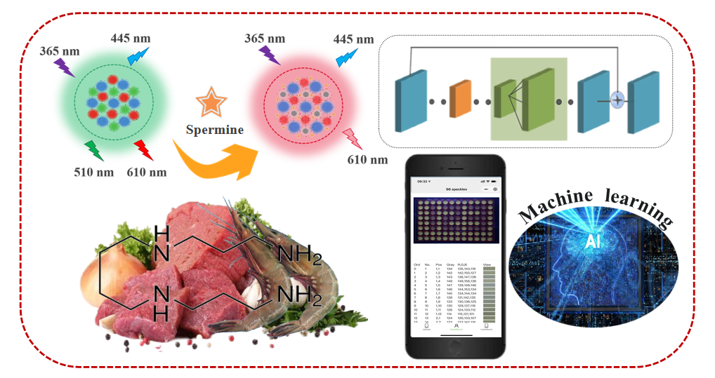随着社会主要矛盾发生变化,人们开始追求高品质高质量的生活方式,对生鲜食品的安全品质更加注重。因此,开发食物品质监测的方法已成为迫切需要。近日,kaiyun登录中国入口登录“功能纳米农业应用创新”学科培育创新团队在国际权威期刊《ACS Applied Materials & Interfaces》(中科院大类TOP期刊,IF=9.5)和《Food Chmiestry》(中科院大类TOP期刊,IF=8.5)上发表题为《Machine Learning-assisted High-throughput Strategy for Real-time Detection of Spermine Using a Triple-emission Ratiometric Probe》和《Deep learning assisted logic gates for real-time identification of natural tetracycline antibiotics》的研究论文。