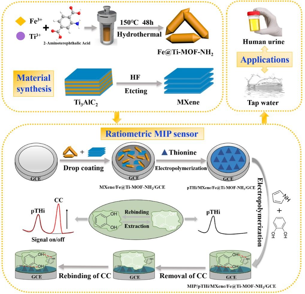 电化学生物传感器多为单信号输出,易受到仪器或环境条件(如低水平或复杂的生物系统)等影响,导致定量分析结果不准确。比率型电化学传感器是基于两个独立的电化学信号比值的变化对目标物进行分析检测,提供双信号和比值分析,可有效减少个体或环境因素的影响,给出更准确的结果。该研究基于电化学原位氧化技术,提出了具有双金属活性位点和高效催化活性的双金属MOF协同高特异性识别的比率分子印迹聚合物用于高选择性和高灵敏度检测儿茶酚。该成果为比率型分子印迹电化学生物传感器的设计提供了新思路,为电化学生物传感器的发展奠定了基础。
