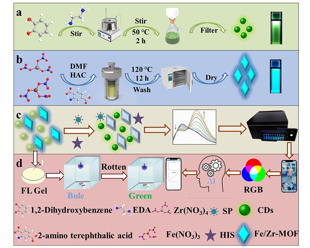 食品腐败不仅会造成巨大的经济损失和资源浪费,而且会对人们的健康造成严重损害。生物胺(BAs)是在由于微生物活动或内源性组织代谢而导致食物变质过程中氨基酸脱羧产生的碱性氮化合物。误食BAs会引起头痛、恶心、心悸、血压变化、呼吸紊乱等过敏反应,严重时会威胁生命。该研究基于双色双发射比率荧光纳米探针(CDs@Fe/Zr-MOF)的内率效应,将该荧光纳米探针固定在水凝胶载体上,冷冻干燥后获得智能荧光水凝胶标签,设计并制备便携式、可视化、实时的凝胶标签光学装置,结合深度学习辅助自主设计的智能手机微信小程序,实现对猪肉和虾样品中精胺和组胺的实时检测。该成果为食品质量安全的即时检测提供了可能,并受到了科学私享等多个公众号的关注。