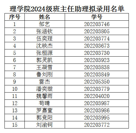 经个人申请、资格审查、笔试、面试等环节,拟录用邹艺等15名同学为2024级新生班主任助理,具体名单如下: