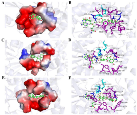 团队通过分子对接与定点突变实验发现,CaFOMT1和CaFOMT2中的酸/碱催化二联体Glu328-His268和Glu333-His274负责黄酮醇底物亲核基团的活化,以加速甲基化进程。CaFOMT1中的ASN-130、ASP-269、ASN-311和CaFOMT2中的ASN-271、ASN-275、E328氨基酸残基则与黄酮醇形成氢键以锚定底物方向,确保甲基供体与黄酮醇底物中的亲核羟基位于最佳反应距离(CaFOMT1:3.4 Å;CaFOMT2:3.1 Å和3.2 Å)。CaFOMT1的底物结合口袋由18个氨基酸组成,其紧密和狭窄的结构确保了CaFOMT1对于槲皮素底物严格的底物专一性。而CaFOMT2的底物结合口袋则由15个氨基酸组成,其口袋结构更为宽松,由此导致黄酮醇底物可以两种不同朝向与其进行结合,因而可发生4’-OH和7-OH两个不同位点的甲基化。虽然两种朝向均通过ASN-271、ASN-275、E328氨基酸残基形成氢键,但CaFOMT2-柽柳黄素复合物的结合力更强,因此CaFOMT2对于柽柳黄素的催化性能优于槲皮素。此外,我们还发现了CaFOMT2中位于底物结合口袋底部的PHE-181和MET-185位点为决定其底物选择性的关键位点。