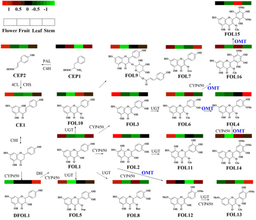 kaiyun登录中国入口登录生物合成化学团队长期从事喜树中功能酶元件发掘与表征。喜树为中国特有药用植物,自从其中发现抗癌药物喜树碱以来备受关注。除具有抗癌活性生物碱生产能力外,该植物同样富产黄酮类成分。团队前期通过靶向代谢组学的方法,从喜树中发掘并鉴定了64种黄酮类成分,并构建了喜树黄酮类成分合成代谢图谱(Syn.Syst.Biotechno., 2022,7,824-836.)。根据化学结构特征,我们发现其中有16种黄酮醇(FOL1-FOL16),其中有6种黄酮醇均以单甲基化或双甲基化的形式存在。这些甲基化修饰位点集中分布在黄酮醇骨架的C3’、C4’、C5’、C7-OH。由此,我们确认在该植物中存有负责黄酮醇C3’、C4’、C5’、C7-OH位置特异性修饰的O-甲基转移酶元件。截至目前为止,仅有10余种黄酮醇O-甲基转移酶(FOMT)被报道,且它们大多具有单位点甲基化活性(3/7/3’/4’/5’-OH),仅有一种CdFOMT5具有槲皮素的3+3’+5+7-OH多位点甲基化能力。