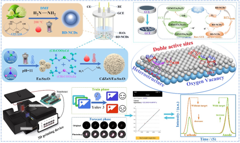 近日,kaiyun登录中国入口登录“功能纳米农业应用创新”学科培育创新团队在国际权威期刊《Nano Today》(中科院1区TOP期刊,IF= 18.962)上发表题为《Rational regulating the Zn/Cd-S-Sn bond and oxygen vacancy environment of CdZnS/Eu2Sn2O7 heterointerface luminophore for highly efficient ratiometric electrochemiluminescence intelligent monitoring of sunset yellow》(合理调控氧空位和Zn/Cd-S-Sn键的CdZnS/Eu2Sn2O7异质结构促进电化学发光信号)的研究论文。该研究利用界面工程策略,制备出具有丰富氧空位和异质界面的CdZnS/Eu2Sn2O7发光材料,系统揭示了双电位电化学发光增强机制与界面调控的构效关系。kaiyun登录中国入口登录生物资源化学专业硕士研究生秦君为论文第一作者,kaiyun登录中国入口登录饶含兵教授和鲁志伟副教授为本文共同通讯作者。该研究得到国家自然科学基金、四川省自然科学基金和kaiyun登录中国入口登录学科建设双支计划的支持。