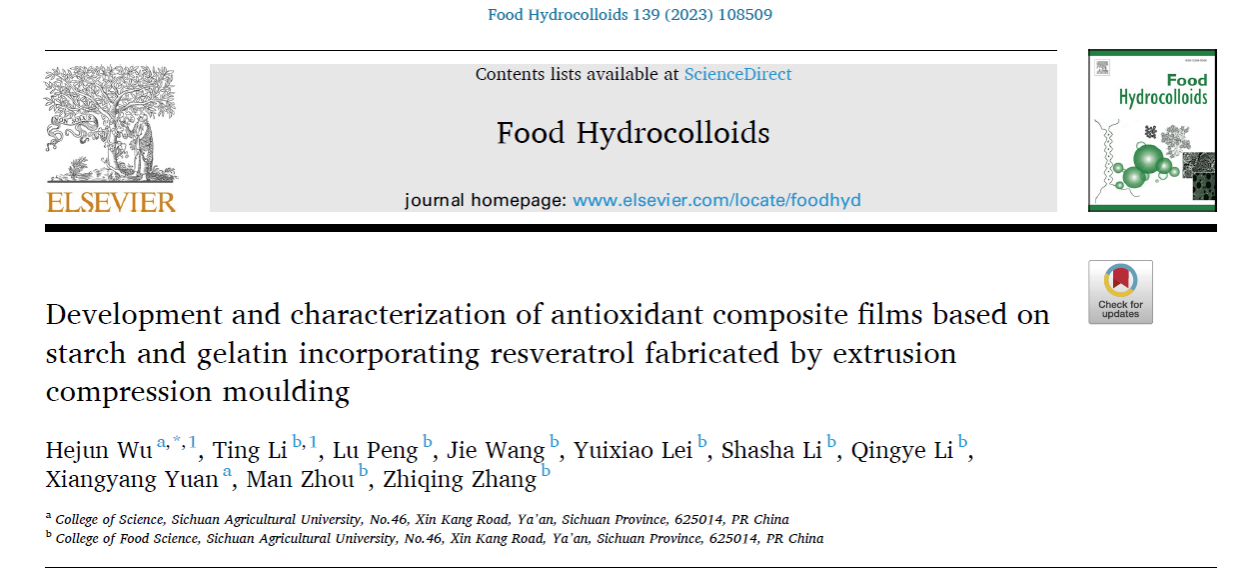 近日,kaiyun登录中国入口登录kaiyun登录中国入口登录新型生物质基复合材料创制与应用团队吴贺君副教授在国际权威期刊《Food Hydrocolloids》(中科院1区Top,影响因子11.504)在线发表题为“Development and characterization of antioxidant composite films based on starch and gelatin incorporating resveratrol fabricated by extrusion compression moulding”的高水平研究论文。吴贺君副教授为第一兼通讯作者,硕士研究生李婷为论文共同第一作者。论文研究得到四川省科技计划项目、kaiyun登录中国入口登录学科建设双支计划项目以及国家级大学生创新创业训练计划项目等资助。
