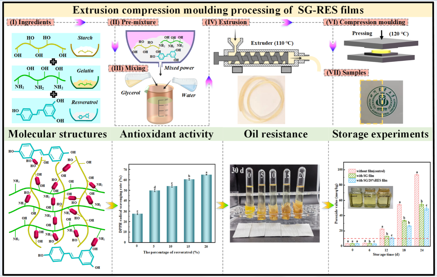 淀粉(Starch, S)作为一种天然可再生资源,具有来源丰富、绿色安全、可再生、可生物降解等特点,目前在可食/可降解包装材料的研发与应用方面备受青睐。但纯淀粉膜存在耐水性差、强度低和功能性不足等缺陷,通过与其它天然大分子或生物活性物质等复合可改善其性能与功能。已有研究表明将可再生且成膜性良好的明胶(gelatin,G)与淀粉共混后所得的复合膜具有良好的机械强度、延展性以及氧阻隔性。但淀粉/明胶(SG)共混体系仍然具有高度亲水性,缺乏抗氧化活性等功能活性,无法满足食品包装的更多需求。添加富含多酚的疏水提取物已被证明可以降低淀粉/明胶共混基质的水敏感性,并进一步赋予其抗氧化等功能活性。其中白藜芦(Resveratrol,RES)是一种多酚类植物化学物质,天然存在于花生、葡萄、桑葚和其他植物的果实和叶子中,被认为是最有前途的抗氧化剂之一,具有抗氧化、抗炎症、抗癌以及心血管保护等多种生理功效。因此,将RES添加到SG共混基质中有望获得性能和功能得以提升的新型复合材料。此外,目前大多数淀粉/明胶复合膜制备通常使用溶液成膜法,干燥时间长、生产能耗高且效率低,只适合实验室操作,难以实现规模化。因此,探索挤出热压或挤出吹塑等热塑性加工方法用于此类材料的规模化制备和功能化改性具有重要的实用价值和研究意义。