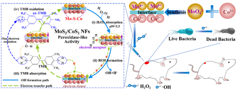 2月15日,kaiyun登录中国入口登录kaiyun登录中国入口登录纳米农业(动植物)功能材料团队的饶含兵教授和孙萌萌副教授等人在国际知名SCI期刊Chemical Engineering Journal (IF=16.744,中科院一区,TOP期刊)上发表了题为《具有双酶样活性的MoS2/CoS2异质结构纳米酶对MRSA感染伤口治疗的抗菌机制》(“Insights into the antibacterial mechanism of MoS2/CoS2 heterostructure nanozymes with double enzyme-like activities for MRSA-infected wound therapy” (DOI: 10.1016/j.cej.2023.141959)),kaiyun登录中国入口登录王广途副教授和2020级生物与医药专业硕士研究生王涛为共同第一作者,饶含兵教授和孙萌萌副教授为共同通讯作者。该研究采用简易熔盐法设计了MoS2/CoS2异质结构纳米酶来解决杀死耐药性细菌以及染菌伤口创面快速愈合的问题。合成的MoS2/CoS2纳米材料间形成清晰的异质界面,加速了电子的传递,大大提高了双酶样活性。此外,该文基于过氧化物酶反应过程中MoS2/CoS2的电子态变化,深入研究了其作用机制。同时,基于过氧化物酶活性,MoS2/CoS2可有效杀灭99%以上的耐药菌,并具有广谱抗菌作用。MoS2/CoS2纳米材料具有良好的生物相容性,可显著促进创面在体内的快速愈合。该研究提供了一种简单的策略来设计具有增强催化活性的纳米酶,并为治疗细菌感染和伤口愈合提供了潜在的思路。