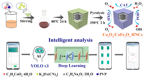 2月18日,该团队在纳米酶催化应用领域取得重要进展,在国际知名期刊ACS Applied Materials & Interfaces(中科院TOP期刊,IF=10.383)上在线发表一篇题为《具有氧空位的Co3O4/CoFe2O4空心纳米立方体作为多功能纳米酶在深度学习辅助智能手机生物传感和有机污染物降解方面的应用》(“Co3O4/CoFe2O4 Hollow Nanocube Multifunctional Nanozyme with Oxygen Vacancies for Deep-Learning-Assisted Smartphone Biosensing and Organic Pollutant Degradation”(https://doi.org/10.1021/acsami.2c22136))。kaiyun登录中国入口登录2020级生物资源化学专业博士研究生姜少娟为论文第一作者,饶含兵教授和孙萌萌副教授为共同通讯作者。该研究结合XPS深度分析和密度泛函理论(DFT)深入探讨了Co3O4/CoFe2O4纳米材料类过氧化物酶的催化机理和检测机理,并就其在农业、食品、环境污染物降解和医药传感方面的应用作了初步研究。在环境污染物降解方面,Co3O4/CoFe2O4活化PMS产生的自由基可以高效有毒染料罗丹明B(RhB),降解效率高达99.24%。食品添加剂方面,利用其建立的L-半胱氨酸的传感器可以准确检测瓶装水中L-半胱氨酸的含量,可用于食品添加剂的评价;在医药传感方面,研究团队利用纳米材料的类过氧化物酶活性建立了诺氟沙星检测平台;在农业应用方面,对农作物中的霉菌毒素玉米赤霉烯酮的含量进行检测。同时结合便携式智能手机APP能实现快速、灵敏、实时检测半胱氨酸、诺氟沙星以及玉米赤霉烯酮的含量,进一步拓宽纳米酶的应用。这一成果为设计高活性的多功能纳米酶提供了新的思路,为其催化机理的研究提供了理论依据,并且拓宽了纳米酶在食品添加剂、医药传感和环境污染物降解方面的应用。