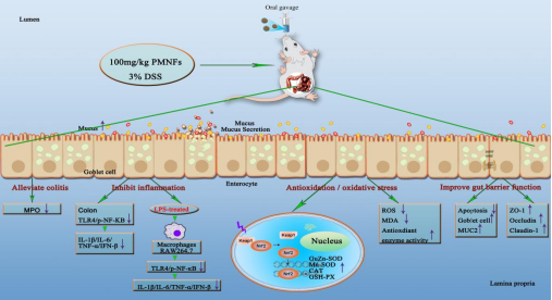 纳米酶是指具有类酶催化活性的功能纳米材料,与天然酶相比,纳米酶能够在温和条件下高效催化酶底物,呈现出类似天然酶的催化效率和酶促反应动力学,并且具有稳定性高、可大量生产等独特优点。王显祥教授团队长期致力于构建和开发具有抗氧化、抗菌功能的纳米酶。经过多次改造和验证,开发出的纳米材料PMNFs在体外具有多酶活性,有很好的抗氧化效果。团队联合动物医学院动物病理学博士郭红瑞团队一起探究了其在DSS诱导的溃疡性结肠炎中的应用效果。研究发现在体内,PMNFs也可以直接清除活性氧,可有效缓解DSS诱导的结肠炎症状。同时,深入的探究了PMNFs的作用机制,其中包括激活抗氧化途径Nrf2-keap1信号增加抗氧化活性,抑制TLR4/NF-κB炎症通路、及维持肠道机械屏障。该研究发现PMNFs纳米酶在抑制结肠炎方面具有独特的作用,在治疗氧化应激引起的各种疾病方面都具有潜在的应用价值。