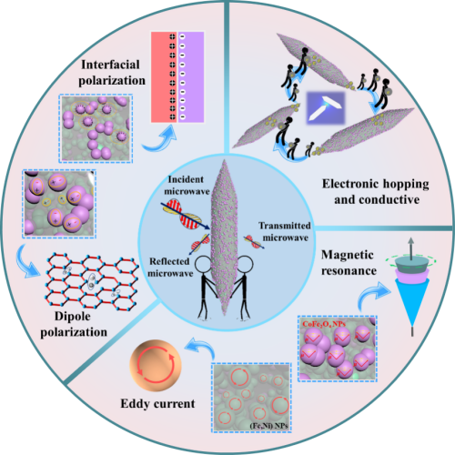 近日,相关研究成果以“Structure regulation in N-doping biconical carbon frame decorated with CoFe2O4and (Fe,Ni) for broadband microwave absorption”(钴铁氧体及铁镍固溶体修饰氮掺杂双棱锥碳的结构调控及宽频微波吸收)为题在线发表于国际学术期刊《Chemical Engineering Journal》(中科院一区TOP,2022即时因子16.768)。kaiyun登录中国入口登录副教授殷鹏飞和应用物理201801本科生唐玉挺为论文的共同第一作者和共同通讯作者,本项研究得到了中央引导地方科技发展面上项目和kaiyun登录中国入口登录学科建设双支计划的支持。