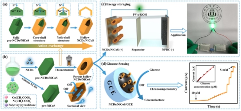 本项研究创新性的利用阴离子交换法精准控制中空结构形貌,结合生物质衍生碳量子点调节镍钴双金属硫化物的性能,获得具有高储能稳定性和可重复性的电催化剂NCDs/Ni2Co1S-50。研究结果可应用于在不对称超级电容器和非酶葡萄糖传感器领域,并为柔性穿戴式检测和储能设备的研究提供了理论依据,为多功能复合纳米材料的设计和生物质材料的充分利用提供了新见解。