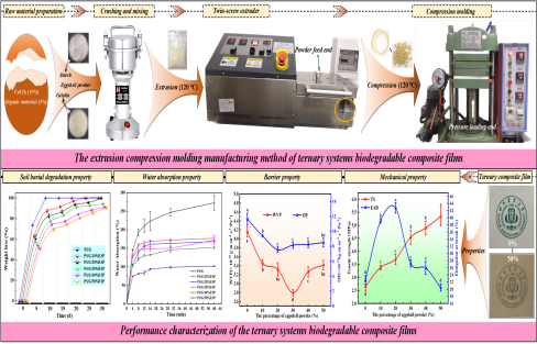 我国是全世界最大的禽蛋的产量和消费量国(约占全球的45%),与此同时每年约产生400万吨的废弃蛋壳,通常未经额外处理就直接被丢弃或填埋,造成严重的环境污染和资源浪费。蛋壳主要由95%的矿物相碳酸钙和约5%的有机成分(如胶原蛋白、硫酸多糖和其他蛋白质)组成。因其具有数量多、密度低、环保和可再生等特点, 近年来蛋壳粉(eggshell power, ESP)被视为一种制备聚合物基复合材料的良好生物填料。淀粉(Starch, S)作为一种天然生物聚合物,具有来源丰富、绿色安全、可再生、可生物降解等特点,在开发环境友好型和可持续食品包装材料方面发挥着重要作用。然而,当前大规模、低成本地生产高性能淀粉基生物可降解材料仍是一项极具挑战性的工作,亟待更多且更深入的创新性研究。