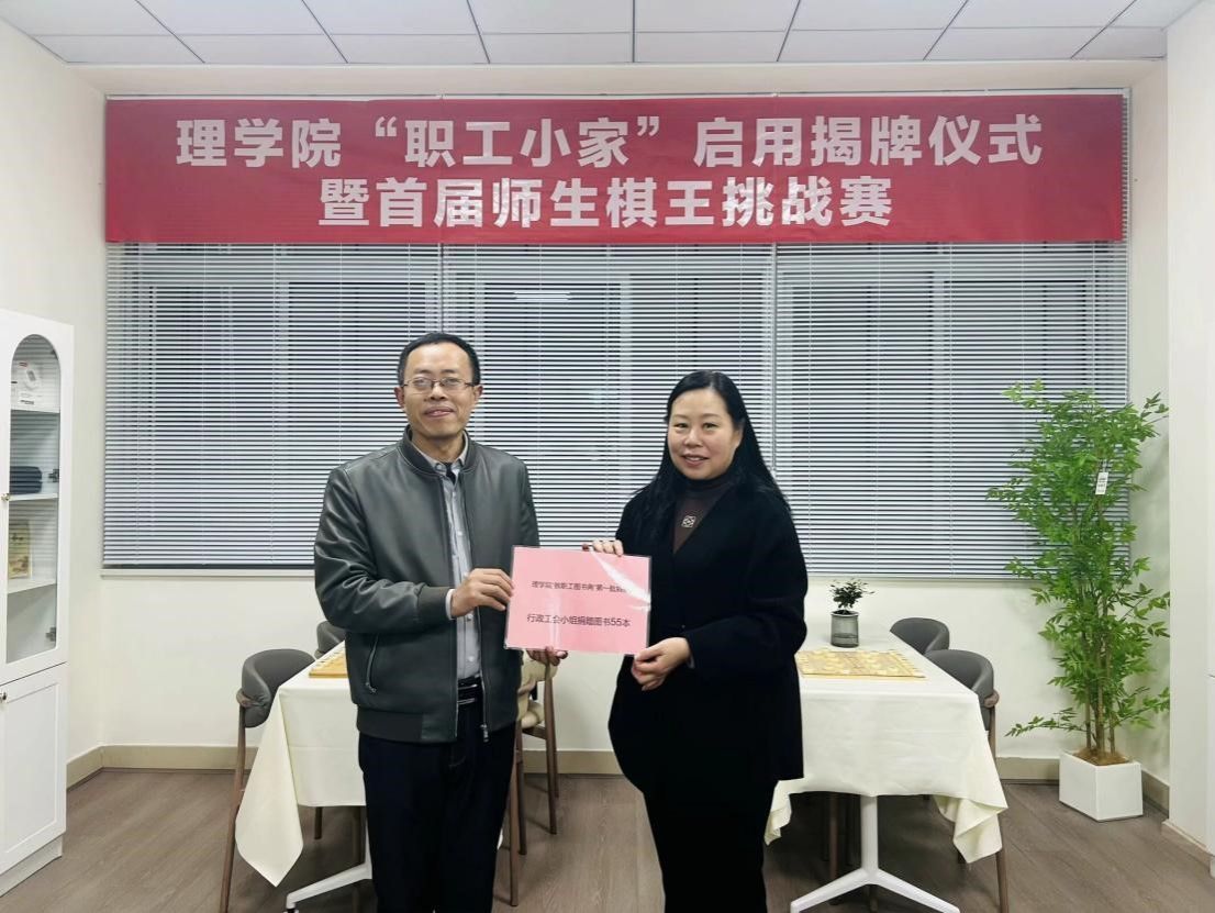 揭牌仪式后,举行了“教职工图书角”图书捐赠活动,行政工会小组组长马学平老师代表向学院工会捐赠第一批图书,学院工会副主席冯兴老师接受捐赠。